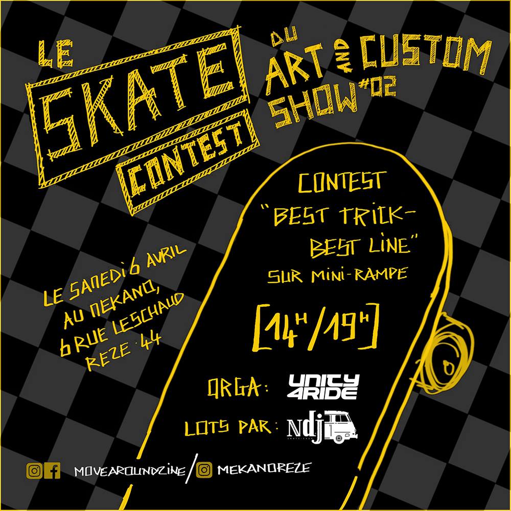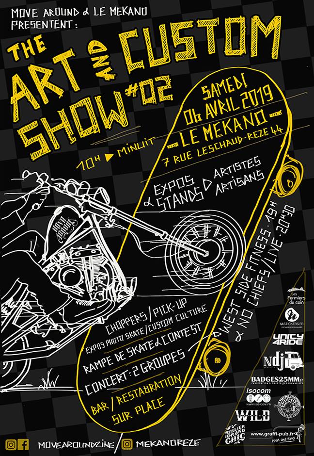 Le magazine Move Around spécialisé dans les motos customs et choppers organise la deuxième édition de son festival ART AND CUSTOM SHOW et ça s’annonce plutôt bien. Le festival se tiendra à Nantes au Mekano le 6 Avril 2019 et au programme : motos, expos, skate, concerts et bière. Une rampe sera dispo pour skater la journée et plusieurs artistes seront sur place pour exposer leur travail. Un contest sera organisé sur la rampe durant l’après-midi ainsi qu’un best tricks. Le tout sera orchestré par 2 groupes alors avec tout ça, vous ne risquez pas de vous ennuyer. Voici quelques photos de l’année dernière, le lien de leur site web et celui de l’évènement sur facebook.
