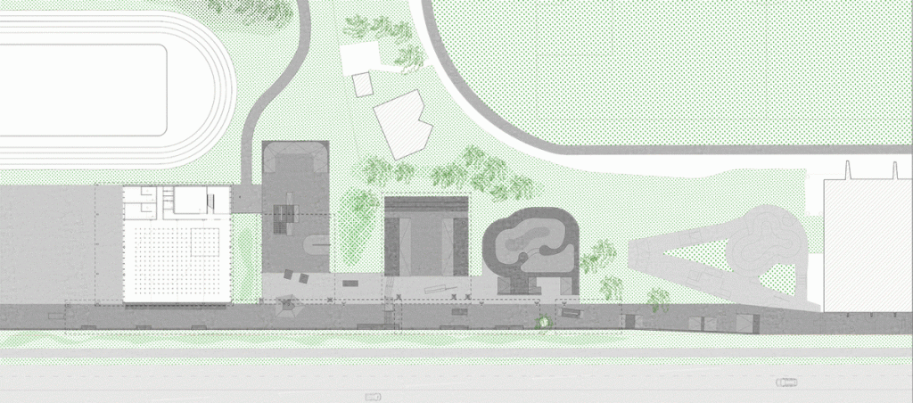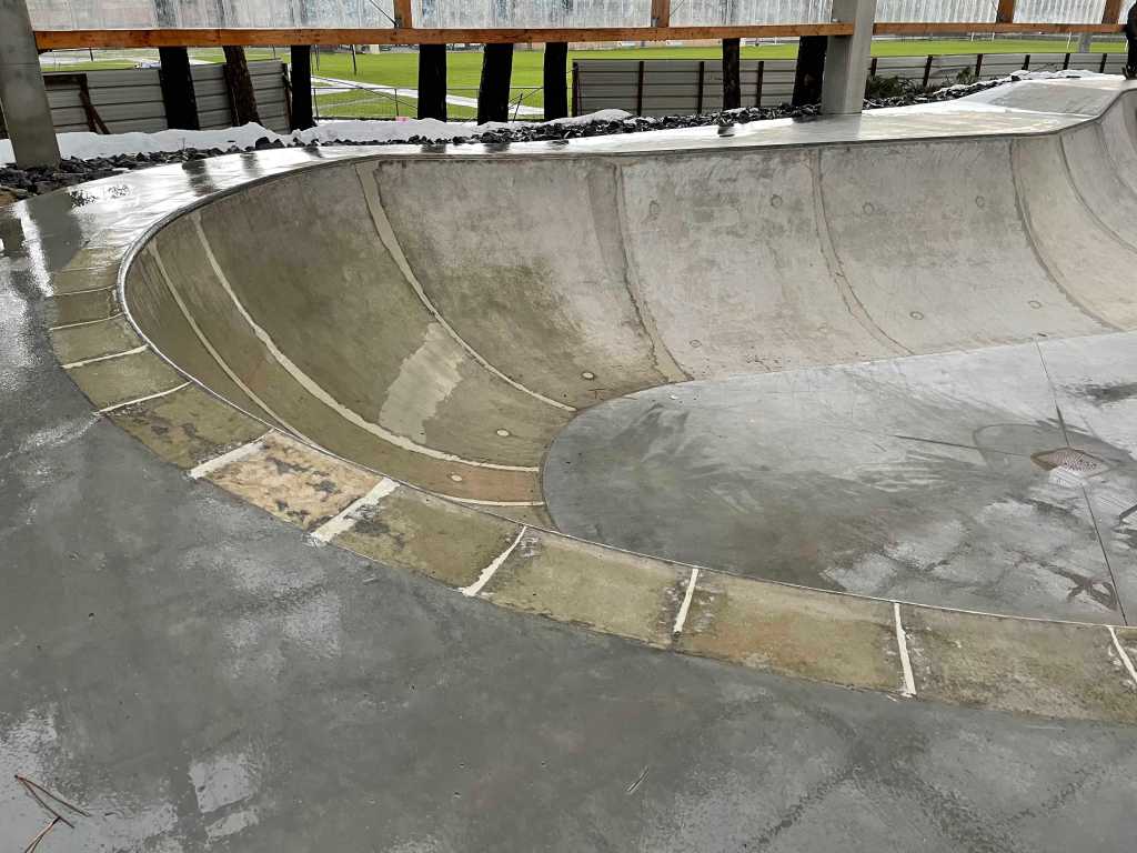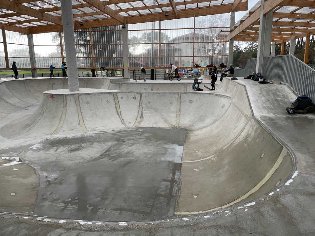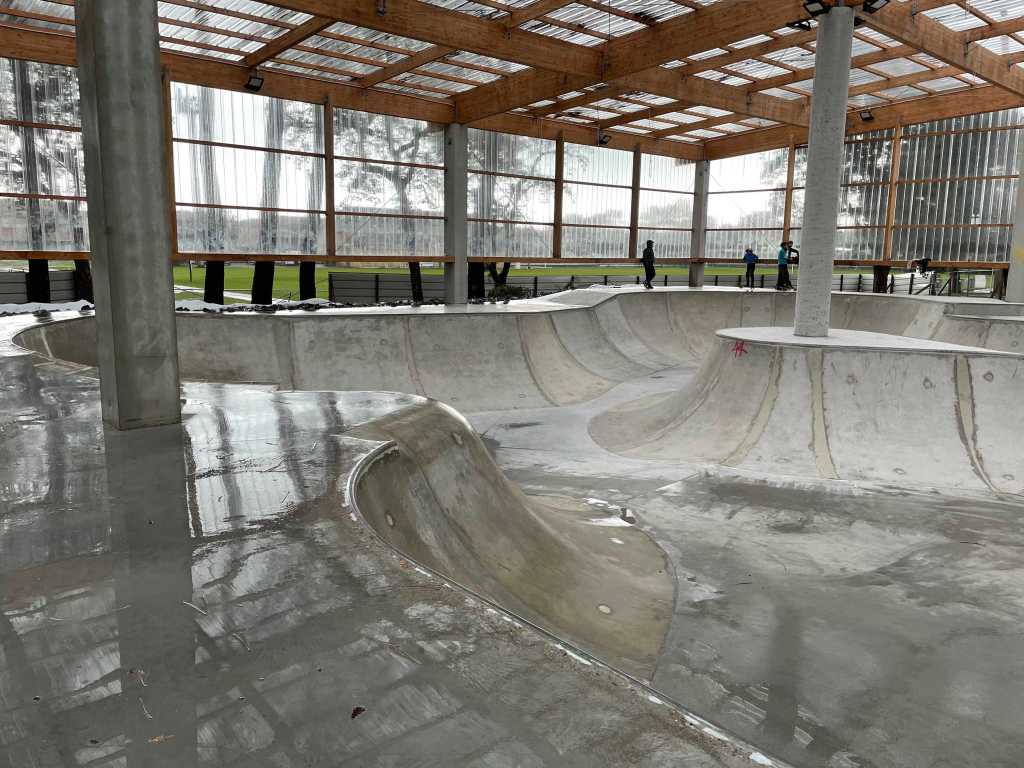 L’extension est situé derrière l’ancien skatepark et est reliée à celui-ci par une vague de béton, il est donc possible d’enchaîner les deux skateparks dans le même run. La nouvelle partie est composée d’un grand bowl à spine couvert et de deux aires de street, une aire de street en forme de couloir couverte et une aire de street découverte. L’ensemble est très grand et tout en béton. Le procédé de construction est assez curieux puisque tous les modules ont été coulés séparément puis amenés sur le park et enfin collés ensemble par du mortier. Le risque avec ce genre de procédé est que les jointures ne tiennent pas et que des fissures apparaissent rapidement. Le toit est aussi très grand en mode gymnase ouvert, du coup la pluie entre par les côtés du park et la majorité du park se retrouve mouillée ou même inondée lorsqu’il pleut. Pas top.